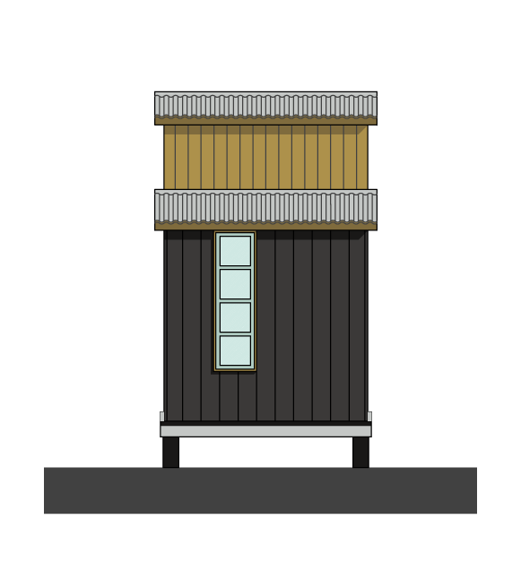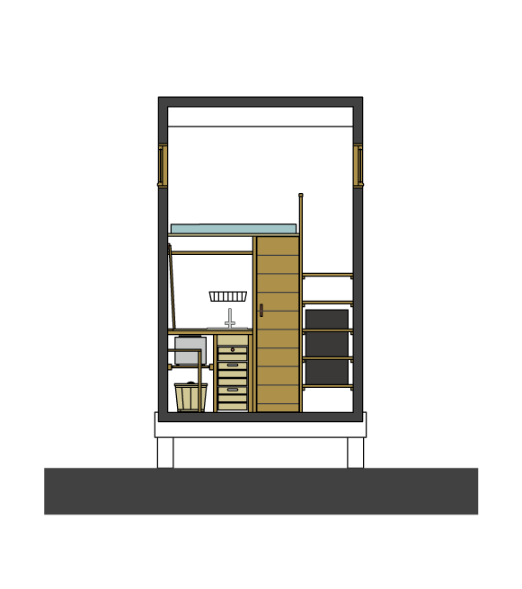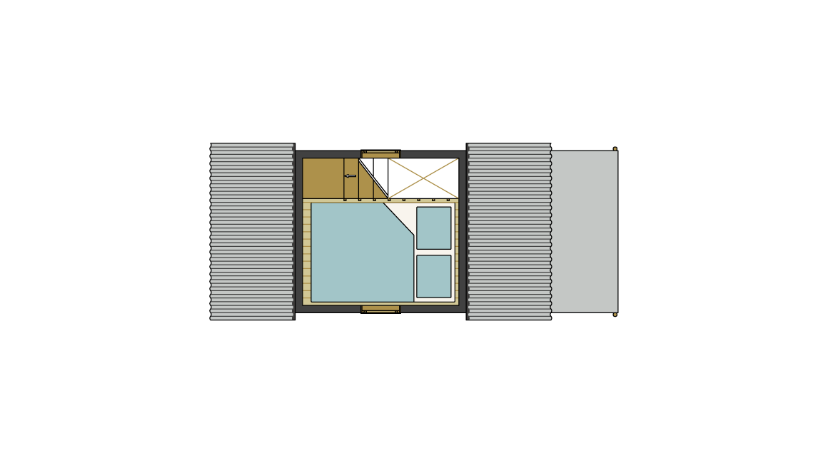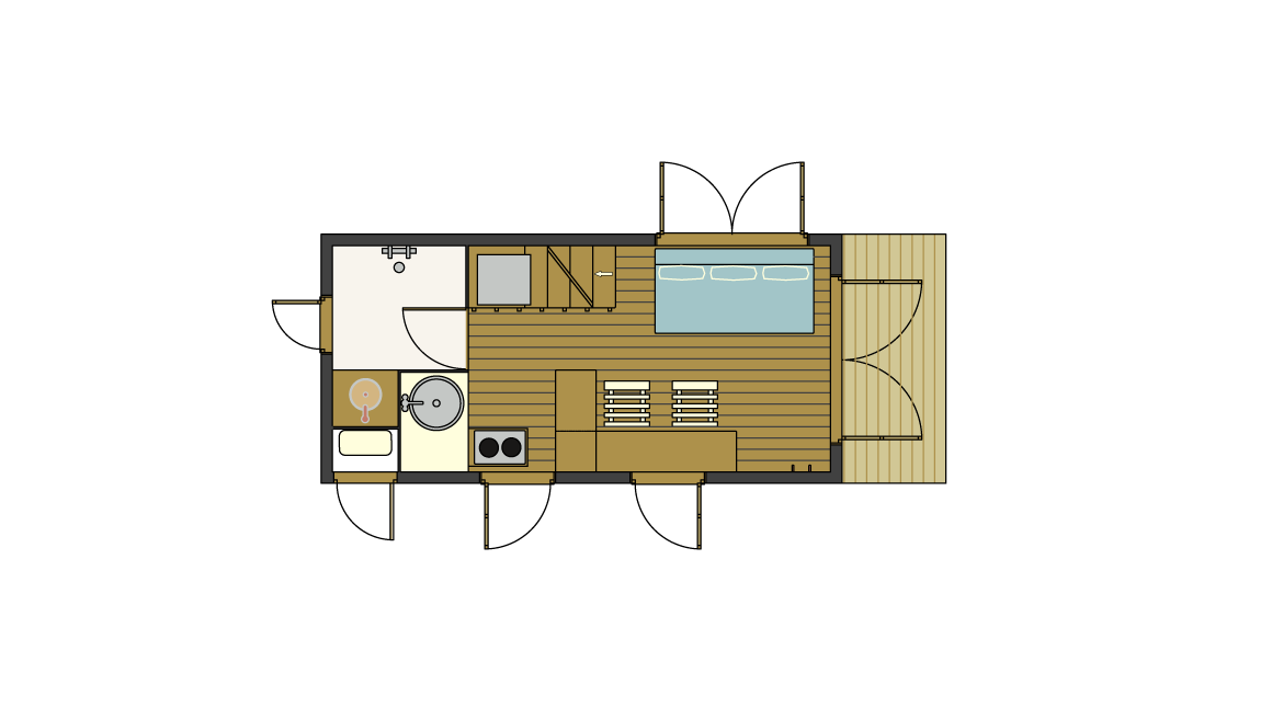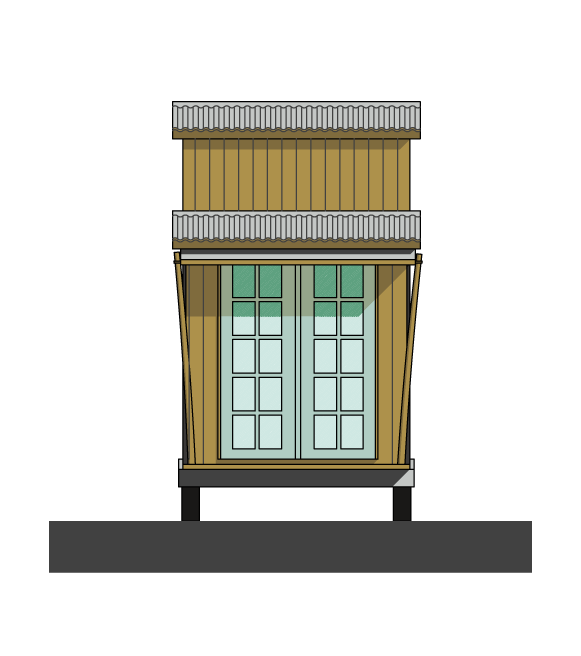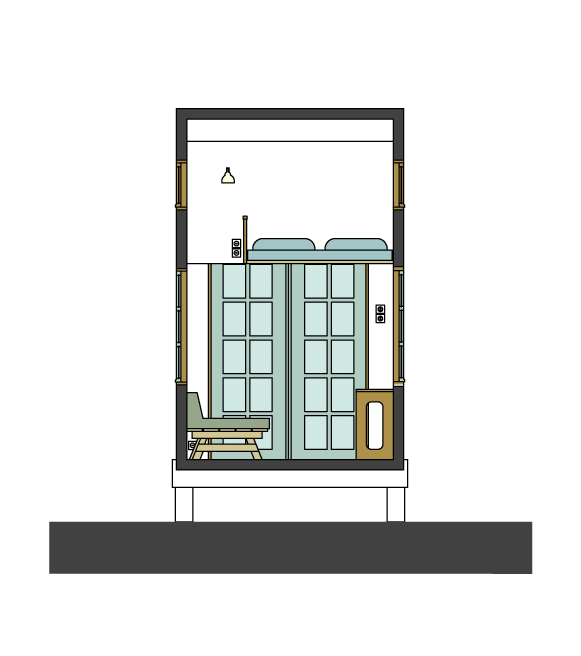 Outside, the roof is corrugated galvanised steel and the walls are clad in locally sourced Douglas fir and corrugated black bitumen fibre sheets. The materials are picked for their sustainability, function and eco friendliness. A porch provides shelter from sun and rain. The service cupboard allows external access to water heater and electrical consumer unit.